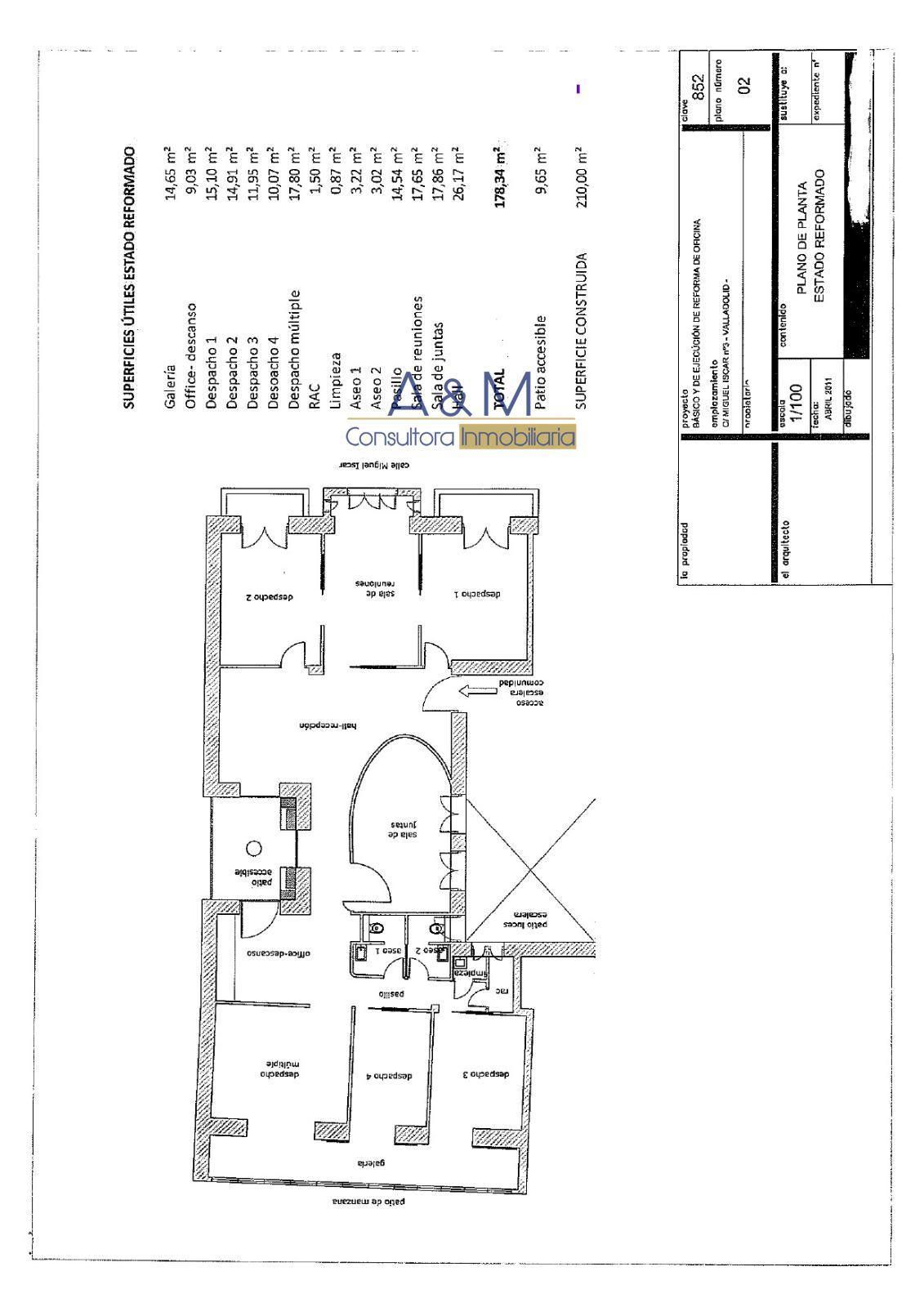 Oficina en alquiler situada en Valladolid, calle Miguel Iscar , con 210 m2 construidos, 178 m2 útiles. Última actividad: oficina, con 2 baños y 6 despachos distribuidos en planta, más sala de reuniones y despacho múltiple, Hall de entrada con dos puestos de trabajo tipo recepción, zona de office-descanso, archivo y sala de juntas. La superficie destaca por su luminosidad, con tres ventanales a Miguel Iscar y ventanas en los despachos hacia patio accesible. Se entrega equipada y amueblada, calefacción por bomba frío-calor y aire acondicionado, luz y agua instaladas, lista para empezar a operar.