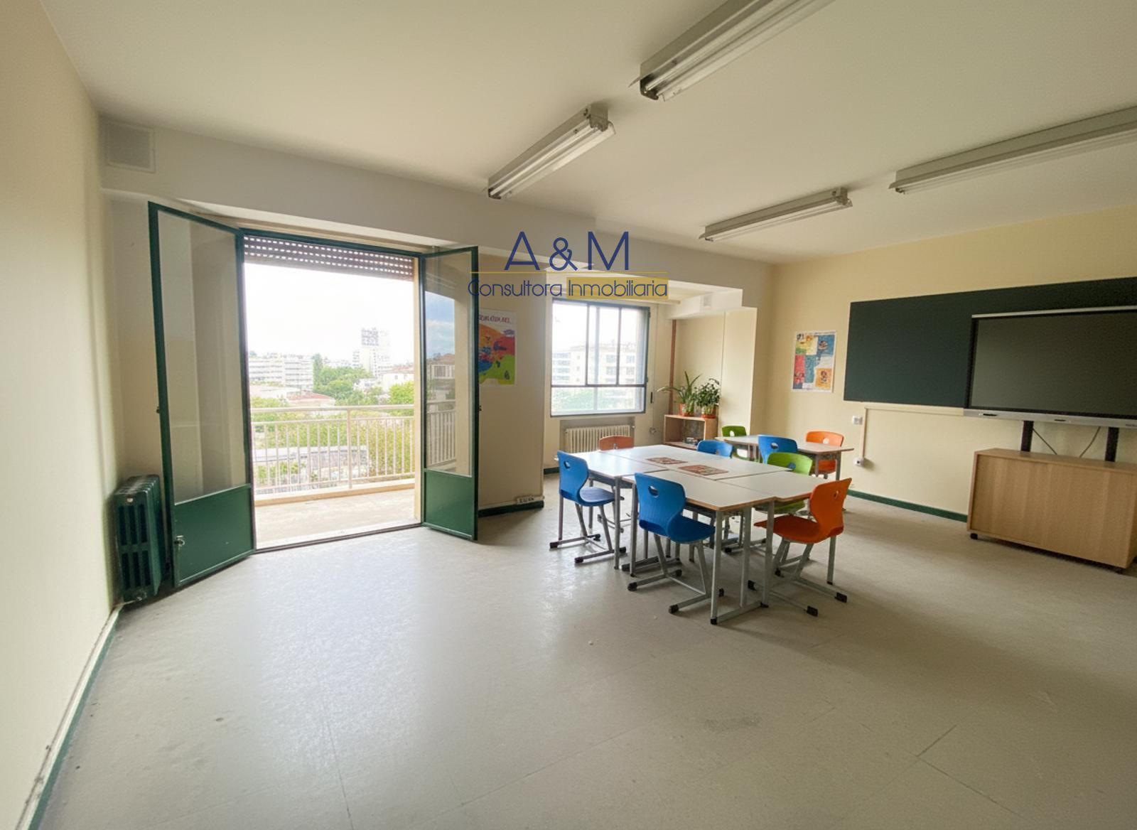 La altura de techos y la amplitud general permiten crear zonas de trabajo abiertas, despachos privados o áreas de coworking, manteniendo la posibilidad de segmentar por necesidades específicas sin perder la coherencia estructural. Se conserva una instalación eléctrica suficiente y prevista para diversas configuraciones, así como luminarias empotradas que pueden ajustarse al diseño final sin obras de gran envergadura. Entre las singularidades del entorno, destaca la presencia de mobiliario de aula antiguo, que aporta carácter y puede integrarse como elemento decorativo o ser eliminado para una estética más contemporánea, según el proyecto.